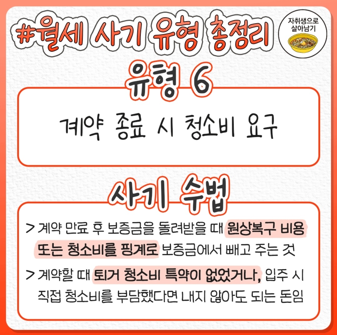 사기까지는 아니지만 계약 만료시 청소비를 요구하는 경우가 종종있습니다. 이러한 내용은 처음 계약 작성할때 청소비에 관한 내용이 없다면 납부하지 않으셔도 되지만 보통 대부분 파손에 대한 원상복구문구는 있기 때문에 청소비와 별도로 파손에 대한 부분은 회복시켜놓으셔야 됩니다.